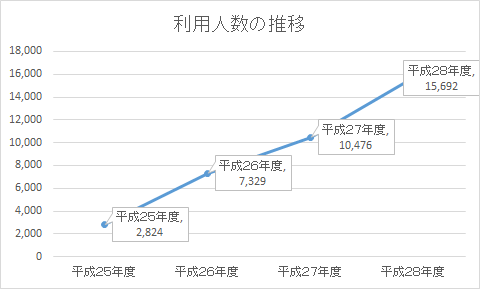 上のグラフは子どもの国の事務所でいただいた資料をもとに作ったものですが、屋内遊び場が初めてオープンした平成25年度と比較するとすごく伸びているのが分かります。