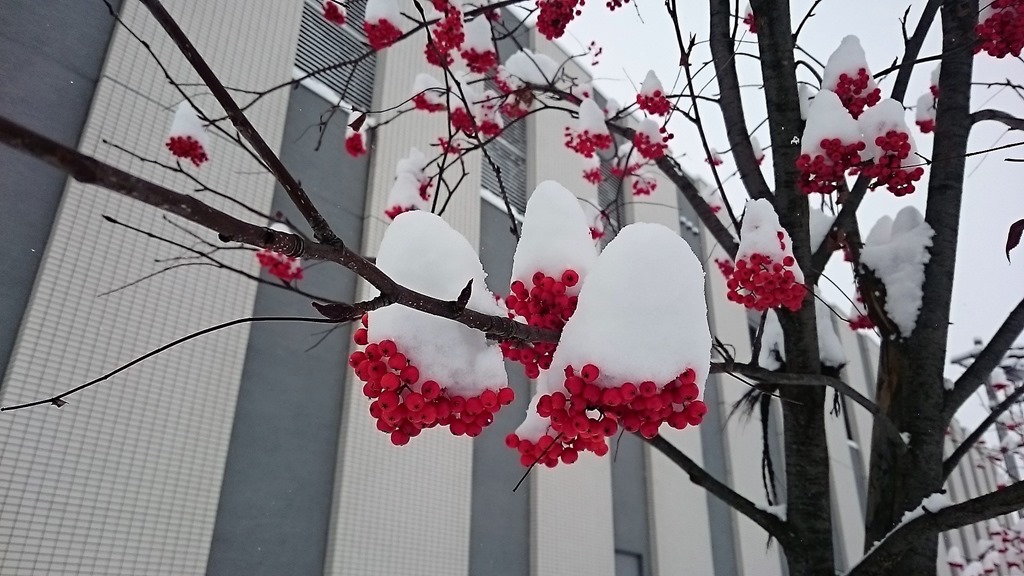 冬も雪も嫌なことばかりではなく、こんな愛らしい姿も見せてくれます。バックの建物は砂川市立病院。