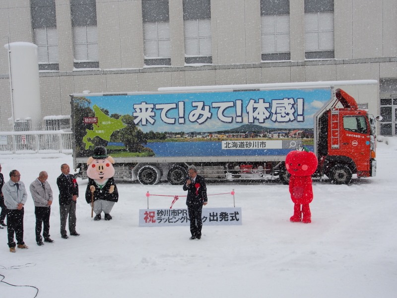 話を聞くと市内に本社がある丸一運輸㈱の砂川市をPRする「ラッピングトラック」の出発式だそうです。
