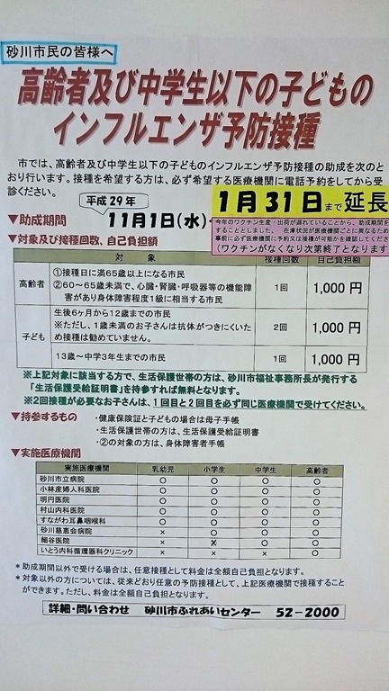 砂川市ではインフルエンザの予防接種費用に助成をしています。また、あまり混み合わない市内の医療機関を選んで行くようにしましょう。