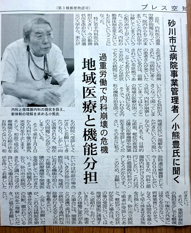 しかし、このままでは内科医の過重労働のため、最悪、内科医が来なくなってしまう心配もあります。砂川市民としては辛いところですが、地域全体の事も考えながら、軽症と思われる時には、まず近くのかかりつけ医にかかるようにしながら、われらの砂川市立病院を大切に守っていきたいと思います。