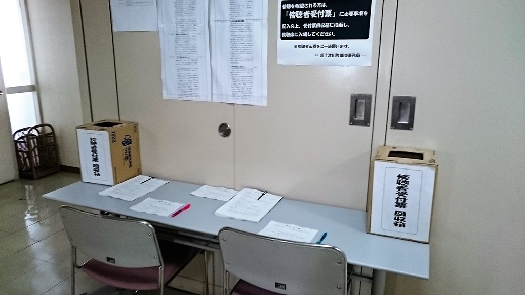 4階の本会議場前で住所、氏名、年齢を書いて傍聴席に座りました。思ったより狭かったので、距離が近いとまず感じました。