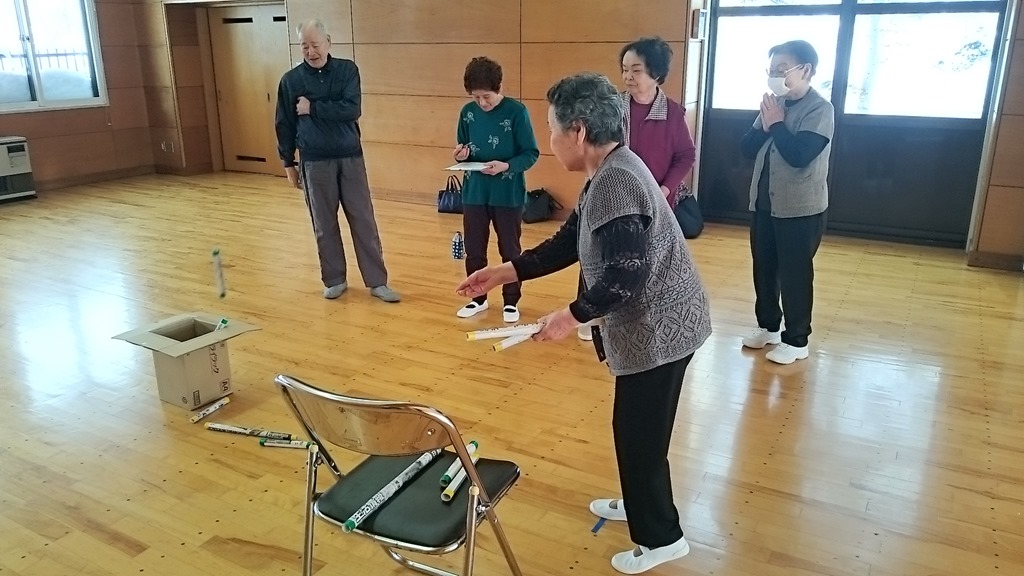上の写真は偶数月に運動後、社会福祉協議会の職員さんがお楽しみレクをしてくれます。今日はダンボールの箱に丸めた新聞紙を投げ入れるゲーム。