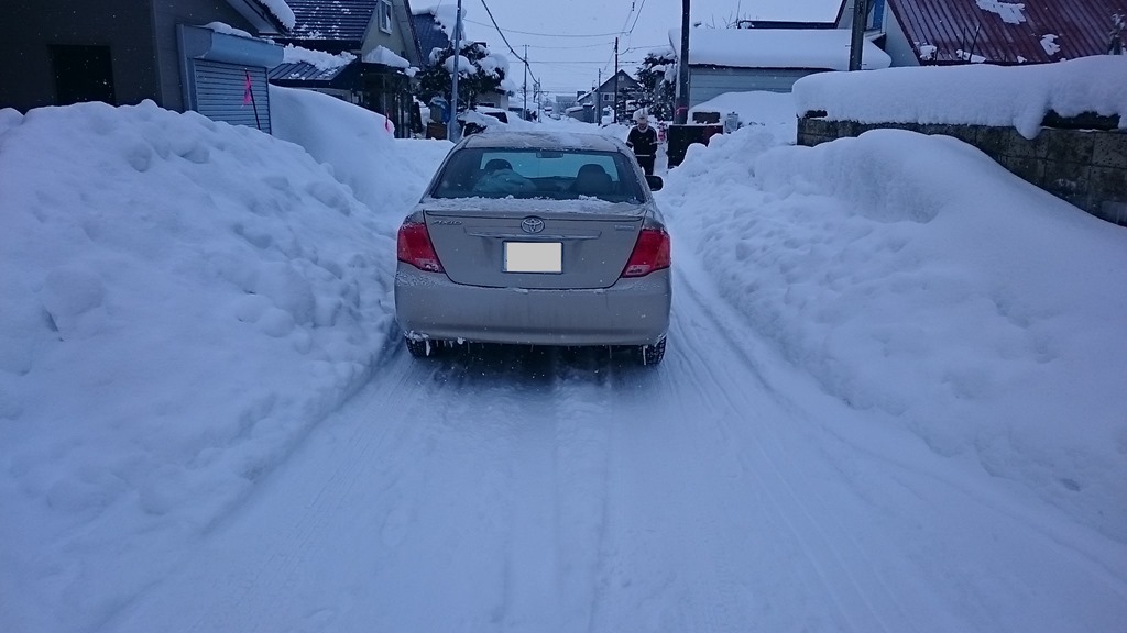 上の写真はある住宅地で街回りの途中ですが、道路の両側に積もった雪で車一台通るのがやっとの状態です。