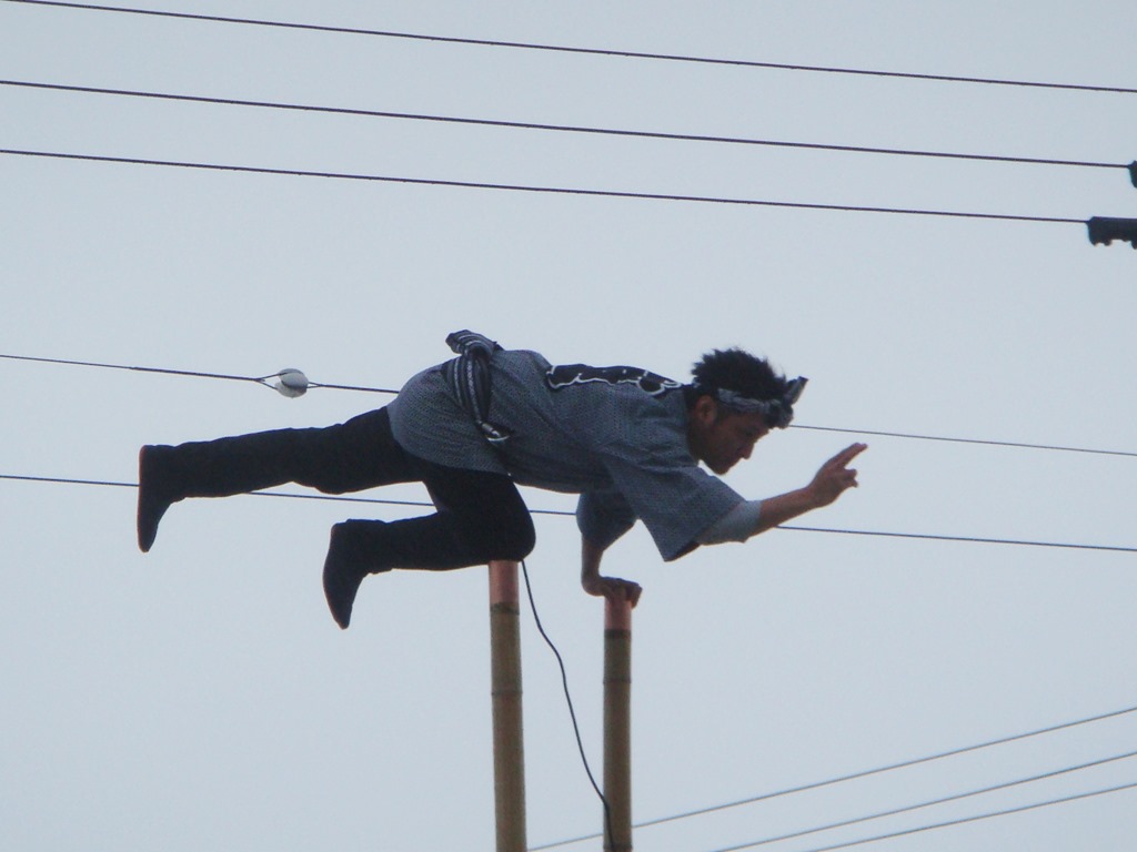 名前は聞き忘れたのですが、3人の演技を写しました。左から「肝潰し」、「腹亀」、「一本八艘」(演習要覧より)だと思いますが、それぞれが雨の中、素晴らしい出来でした。