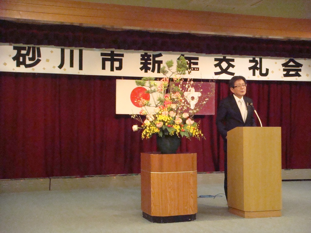 砂川市の新年交礼会は砂川市、商工会議所、建設協会が合同で開催しています。したがって、他のまちよりは遅い日程となります。上の写真は善岡市長の「年頭の挨拶」です。