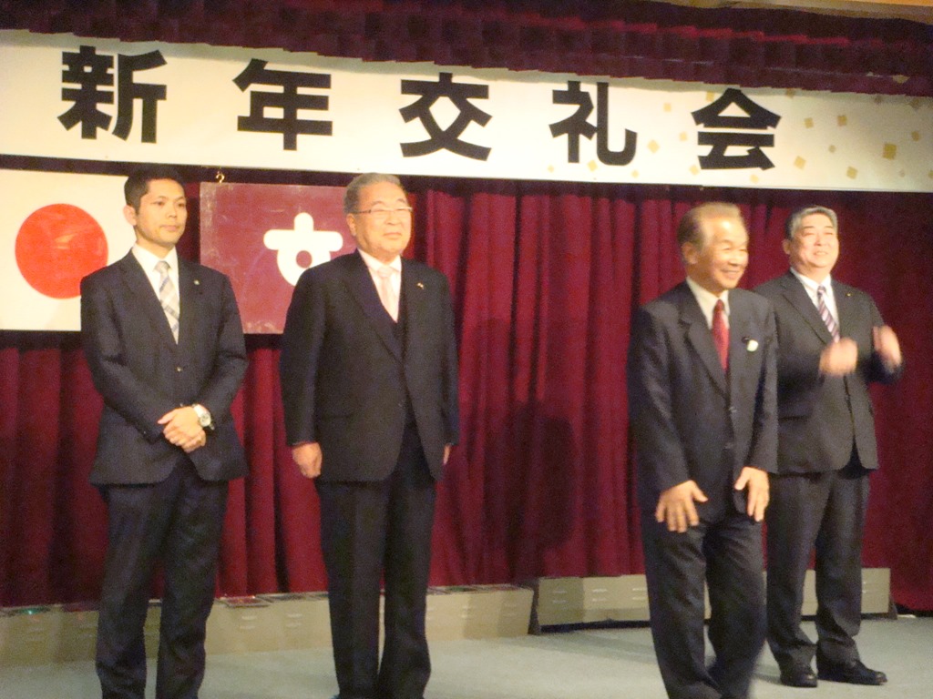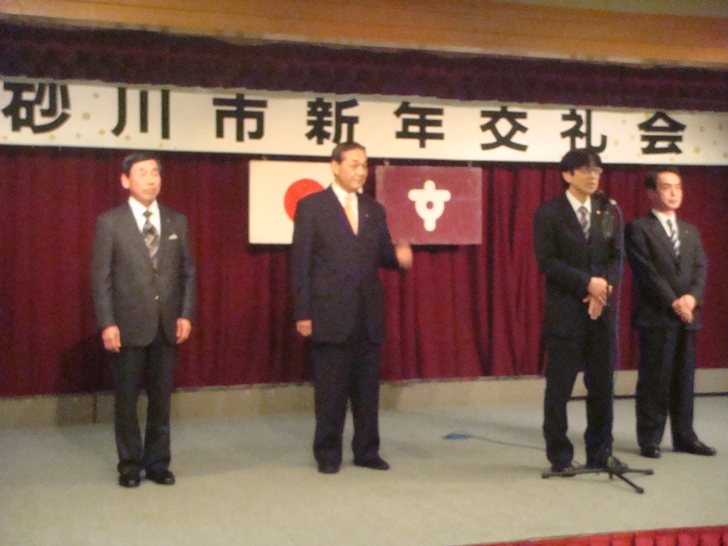 写真が少々ボケましたが、万歳三唱(の代わりに三本締め)は共催の砂川商工会議所の正副会頭、専務理事が行いました。其田会頭は『今年は統一地方選があるが、1月から事業の執行をお願いしたい』と挨拶されました。