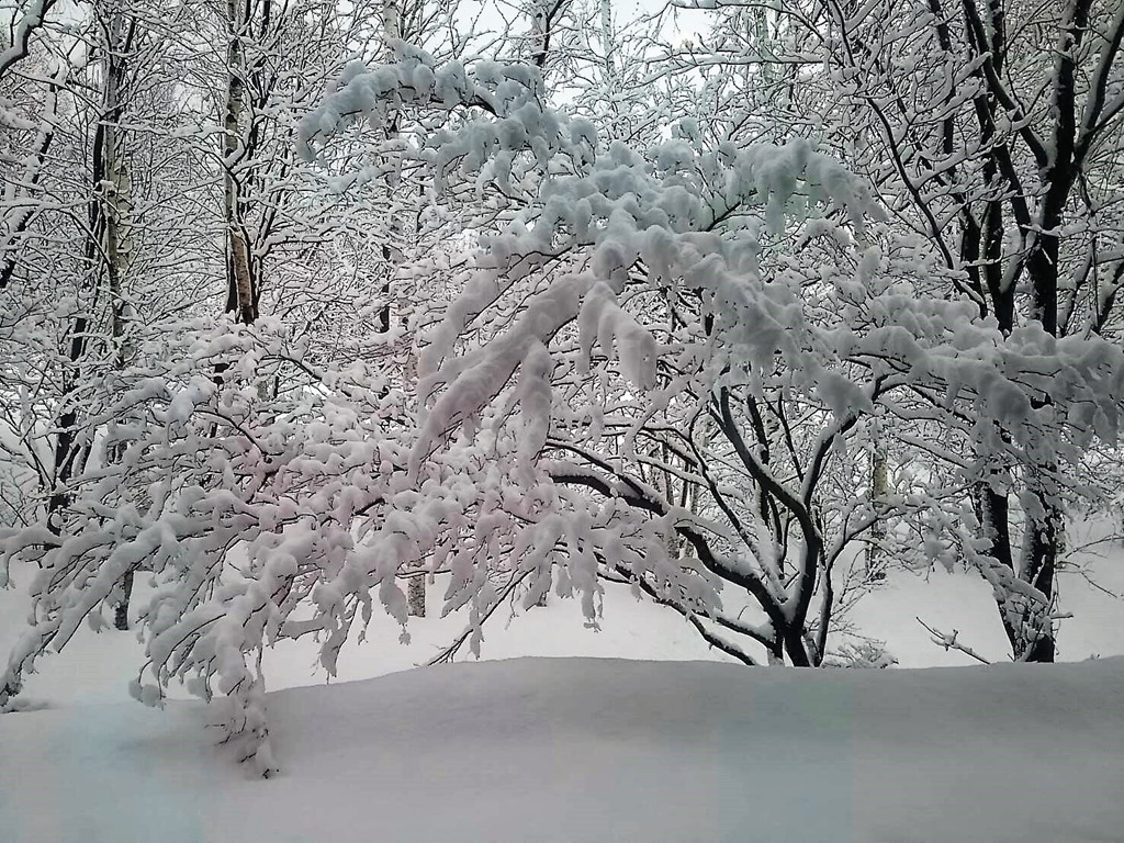 本日は湿った重たい雪で除雪も大変でした。しかし、その湿った雪が枯れ木に綿のような花を咲かせます。これも北国だからこその風景。