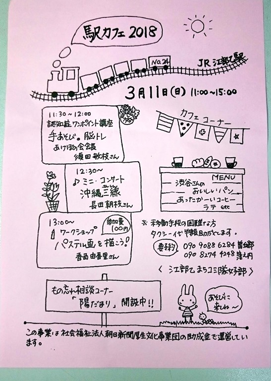 来月の「駅カフェ」のチラシが上の写真。なんか凄いパワーを感じます。『移動手段の困難な方 タクシー代半額助成します。』って書いてありますネ。