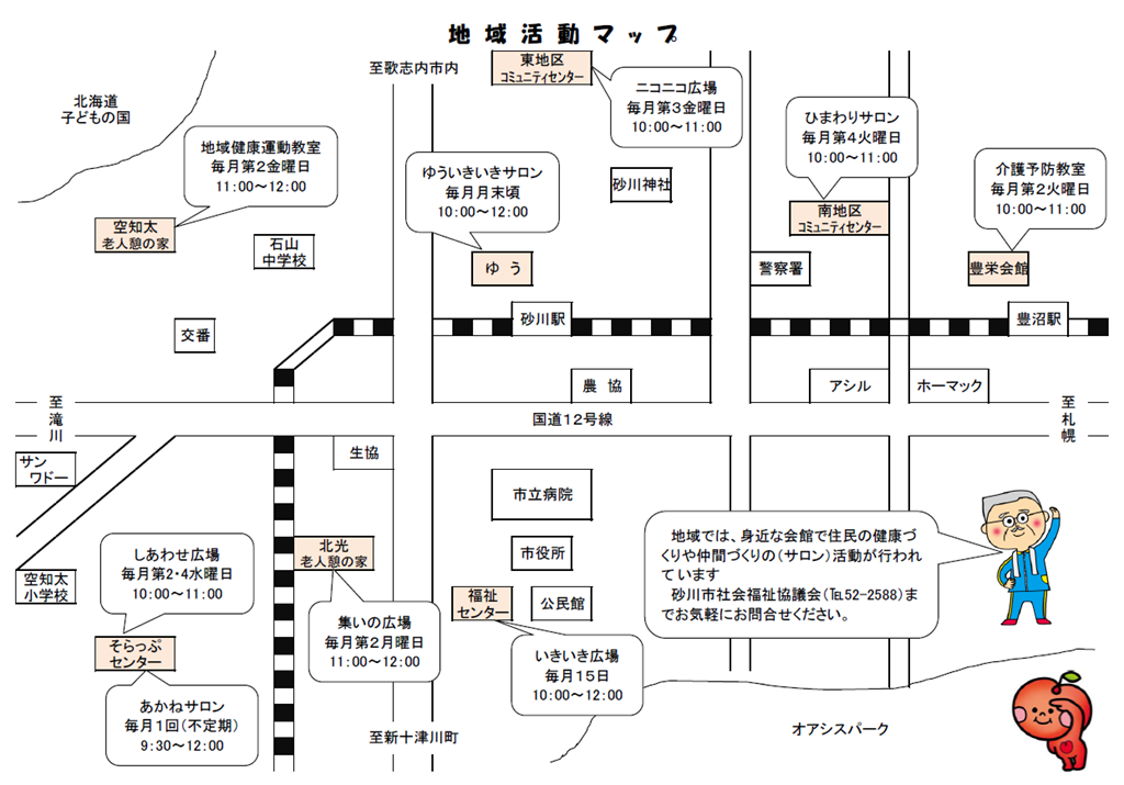 上のマップはちょっと古いのですが砂川市のHPから検索して掲載しています。上の表と合わせると、どこでいつ開催されているのか分かります。