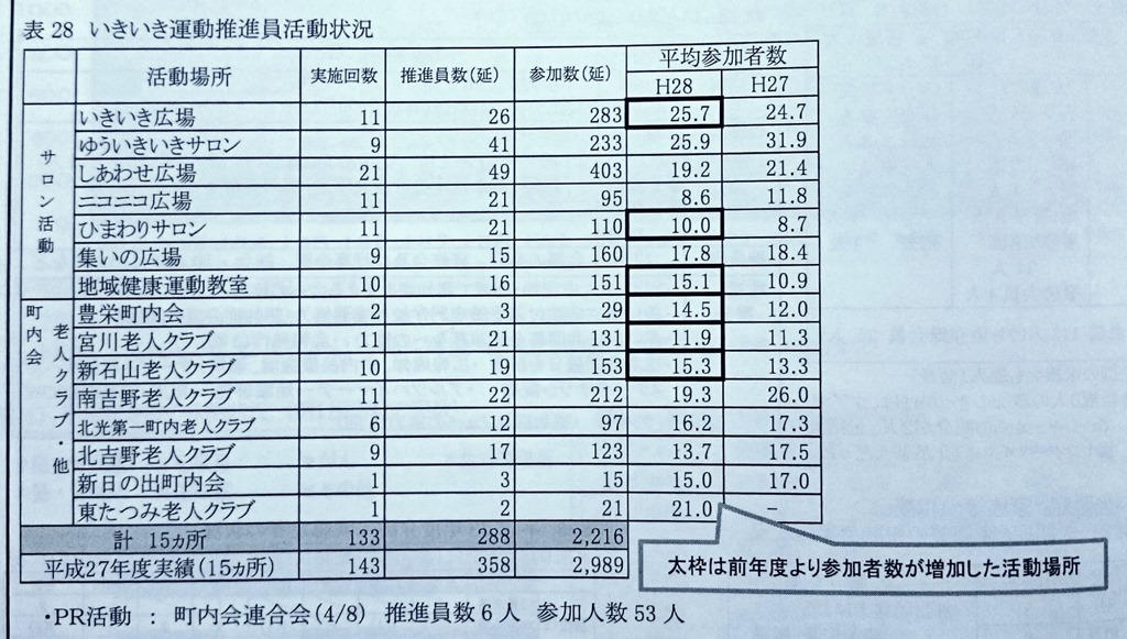 上の資料は「砂川市の保健活動」という冊子からですが、ふれあいセンターが出しています。平成28年度のいきいき運動推進員さん達の活動がまとめられています。