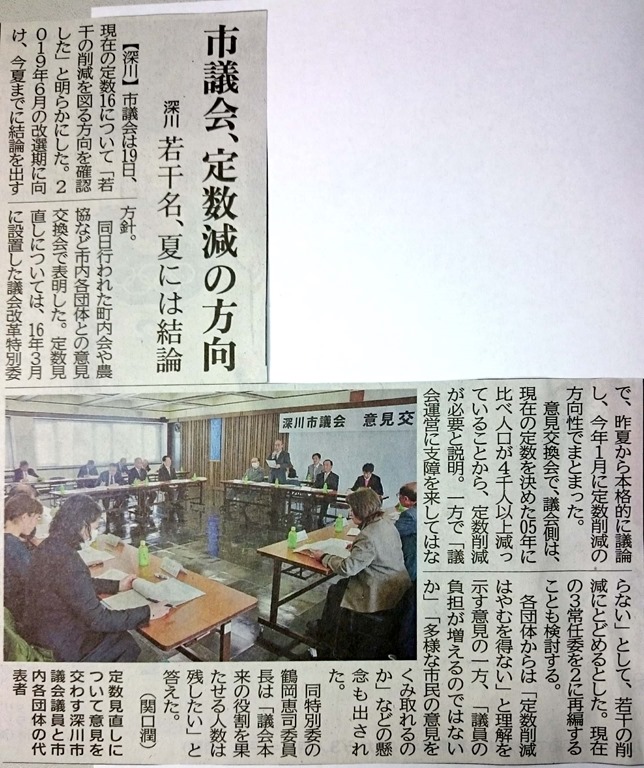 新聞報道では深川市議会の議員定数を何人削減するのか今年の夏までに結論を出すと書かれています。