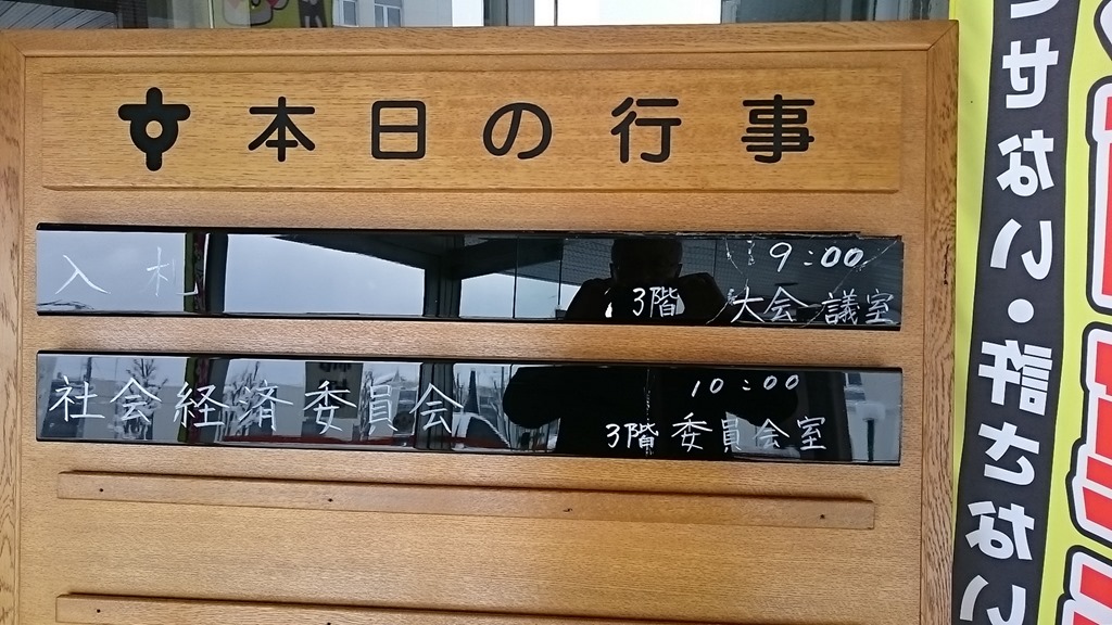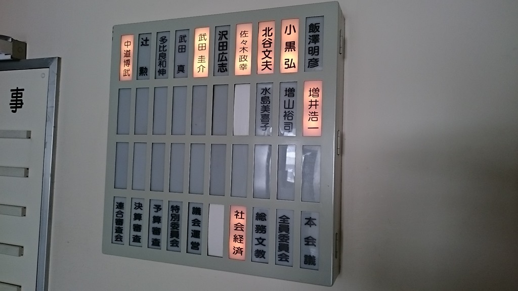左の写真は市役所正面玄関を入って右側にある看板。そして、右の写真は議会事務局横にある議員登退庁表示板です。