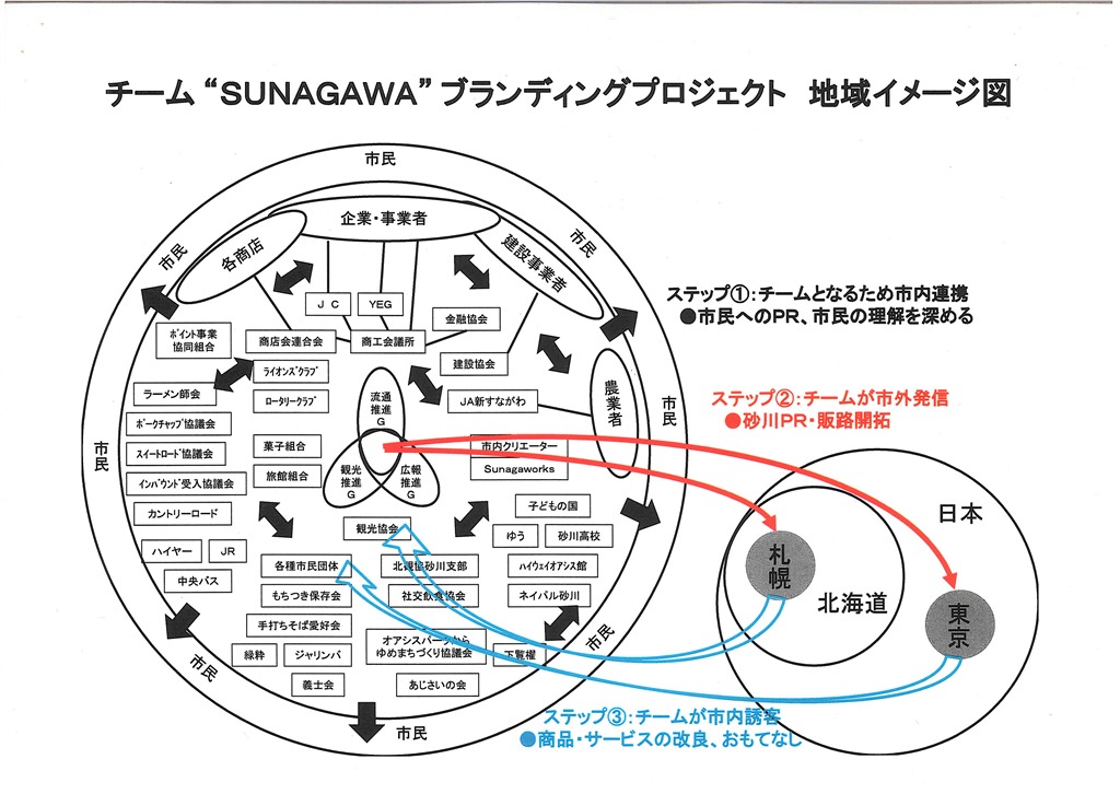 地域が一体となって砂川市民の理解を求め、市外へ発信し、砂川ブランドにより市内誘客を図り、地域経済の活性化を目指す模式図です。