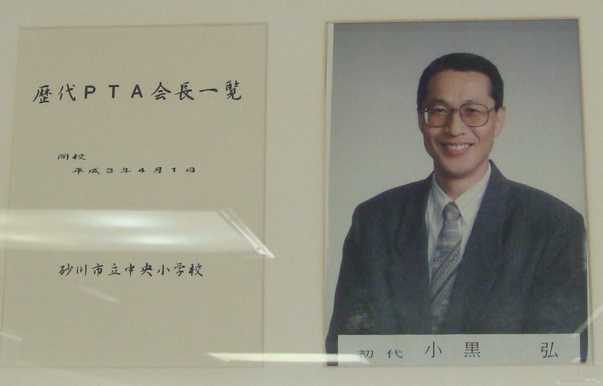 そして、右は焼山小、旧中央小、そして、砂川小だった一部地域が学区変更となり「新中央小」が開校されて初代PTA会長の写真。私は開校式典を行うという貴重な経験をさせていただきました。
