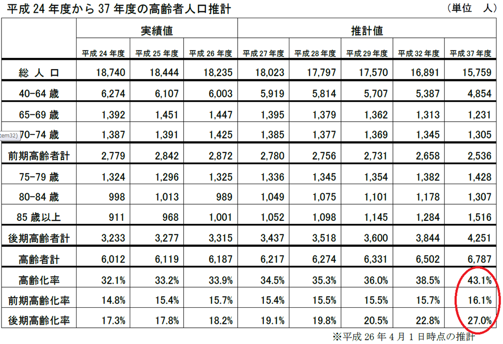 上の表は、砂川市で現在策定中の「第6期砂川市高齢者保健福祉計画・介護保険事業計画(素案)」にある「平成24年度から平成37年度の高齢者人口推計」ですが、不思議なことに、現在の晴見町内会の高齢化率などと10年後の砂川市の推計数字と、ほぼ同じでした。