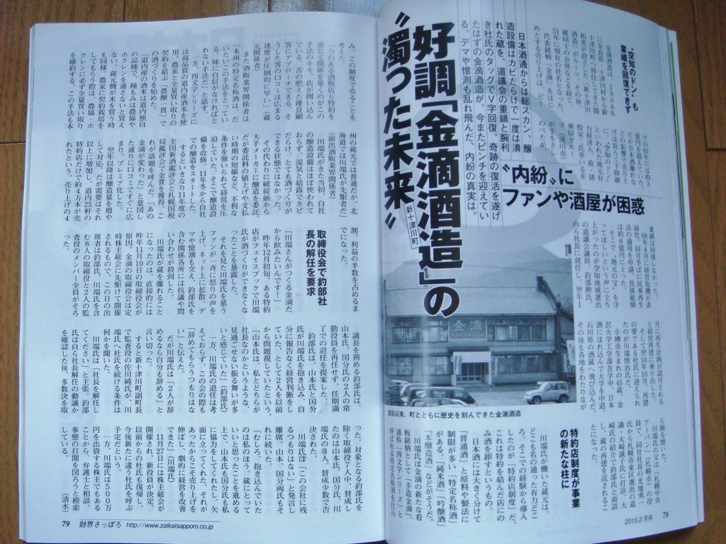 新しい、砂川名物となり、関連商品も出始めた所ですが、蔵元の金滴酒造が揺れているようです。一昨日の夕方、HTBテレビで放映されたり、昨日、発売された「財界さっぽろ」の記事にもありました。(写真)