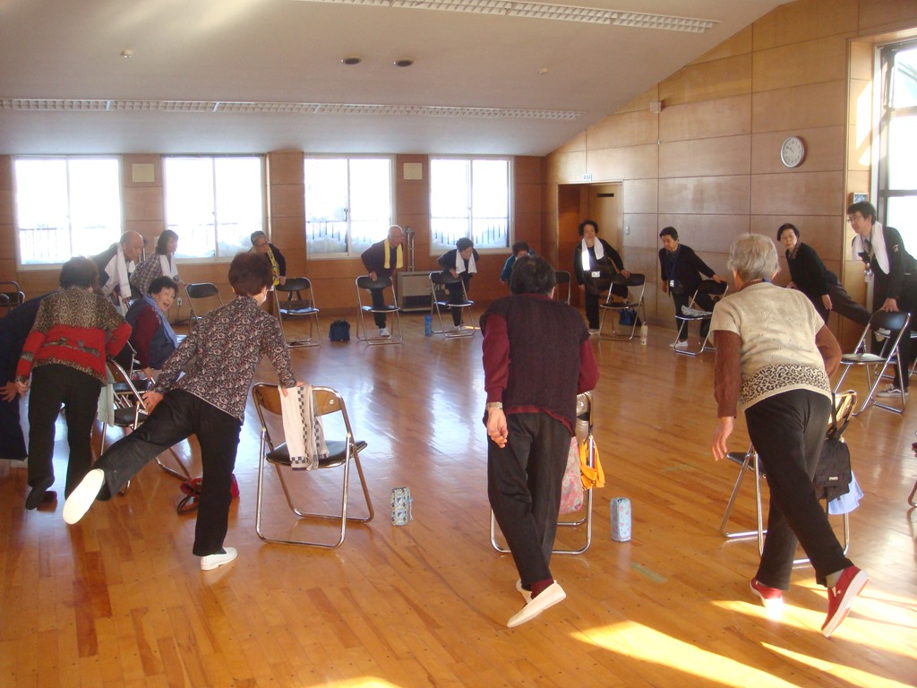 東地区コミセンでは、いつものように「いきいき運動推進員」のボランティアのお二人の指導で1時間、体を動かしました。