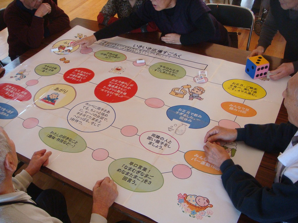 続いて、社会福祉協議会の皆さんが、2ヵ月に一回のペースで、レクレーションを行ってくれました。年始の挨拶をしながらジャンケンをし、勝った人にお菓子を渡すゲームと、右の写真は社協の手づくり「すごろく」で、参加した皆さんは本当にニコニコ!でした。
