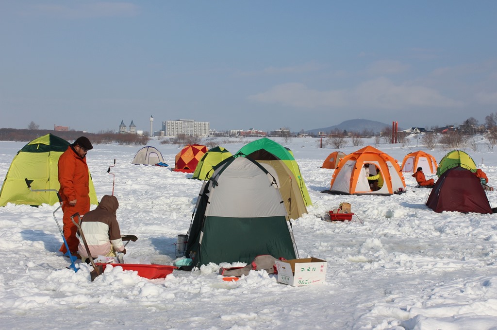 上の写真は15日(木)のオアシスパークのワカサギ釣りです。平日なのに駐車場は旭川、釧路、室蘭ナンバーの車もあって人気の高さが分かります。