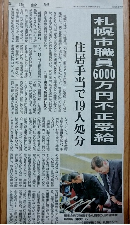 昨日、本日と北海道新聞の一面トップ記事が札幌市職員の住居手当不正受給関連のものでした。