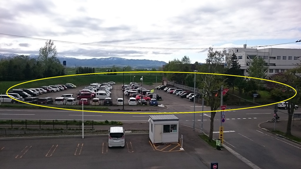 上の写真は市立病院の立体駐車場4階から写したものですが、新庁舎の建設場所を黄色の輪で示しました。