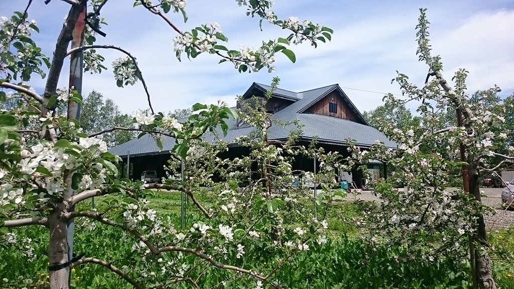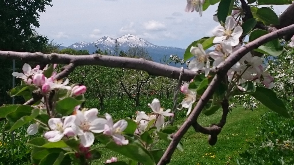 昨日は菜の花とピンネシリでしたが、本日はリンゴの花とピンネ。三谷果樹園のリンゴの花も満開近しです。