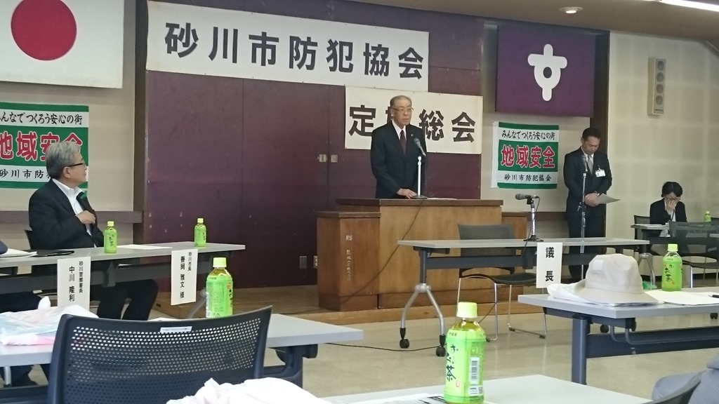 午後2時から始まった「砂川市防犯協会」の定期総会に行きました。写真左は村山会長が挨拶しているところですが、防犯協会は市制施行とともに誕生したそうで、今年で60周年を迎えるとのこと。