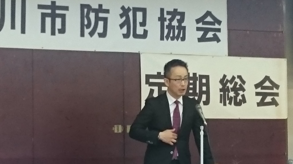 写真右は総会終了後に行われた砂川警察署による防犯講演会で話をされる刑事・生活安全課の長谷川課長です。