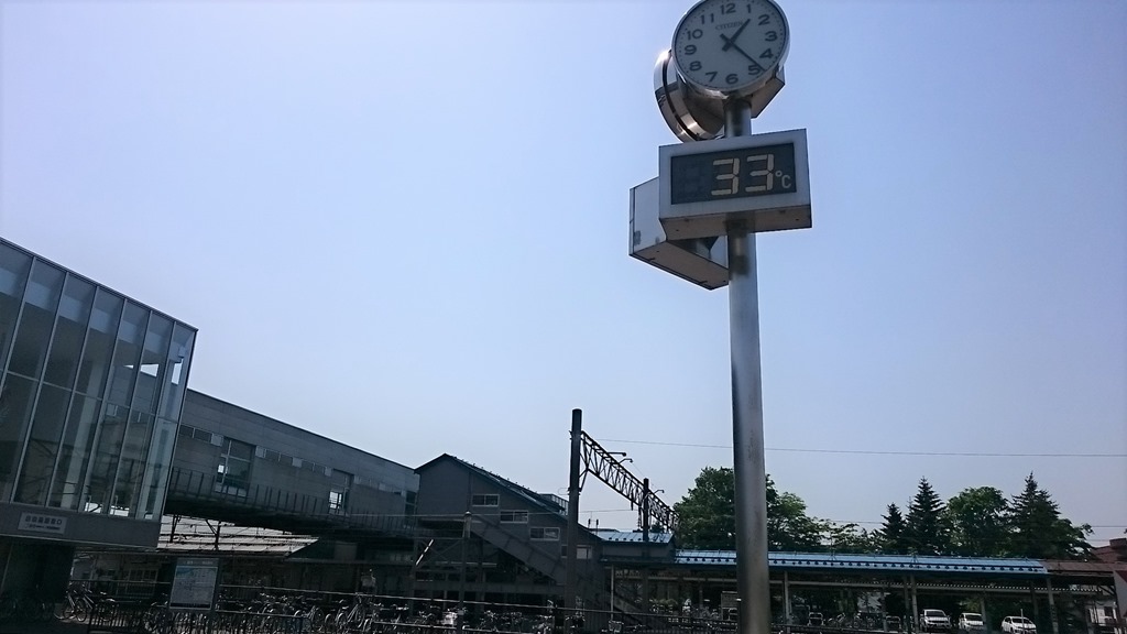 ご覧ください。砂川駅直結の地域交流センター「ゆう」の前にある温度計が33℃を示しています。暑いです!ただ、さすがは砂川で日陰に入れば涼しい北海道の猛暑です。