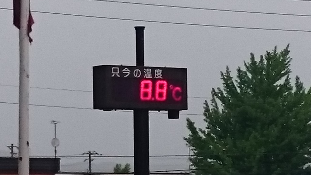 上の写真は午後3時20分ごろの市役所庁舎前にある温度計ですが、ご覧下さい8.8℃です。砂川は寒いです。