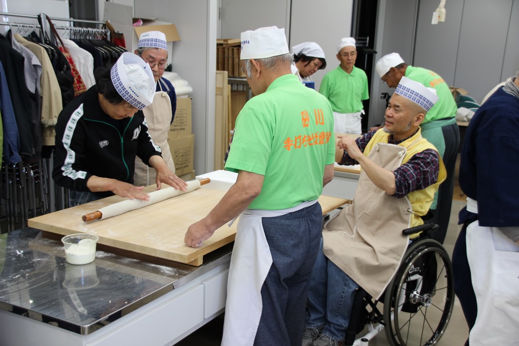 そして、こちらは午前11時から地域交流センター「ゆう」の食品工房で行われた砂川身体障害者福祉協会が開催した「障害者社会参加総合推進事業」で「砂川手打ちそば愛好会」が手打ちそば体験をお手伝いした様子です。