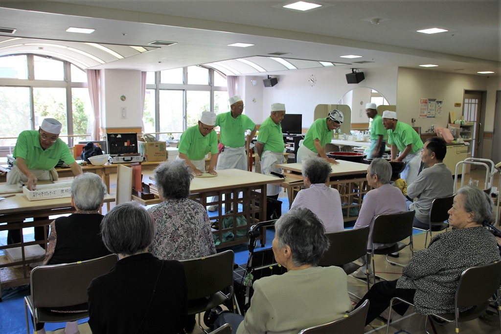 この事業は毎年行っていますが、職員さんも含め130人分のお蕎麦を朝から打って、施設の厨房で茹でて、昼食に提供します。