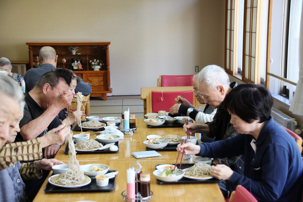 上の写真は打ち立て、茹で立てのお蕎麦を食べていただきました。中にはお蕎麦の食べられない方や長いままでは無理な方もいらっしゃいますが、皆さん『美味しい!』と言って下さいました。