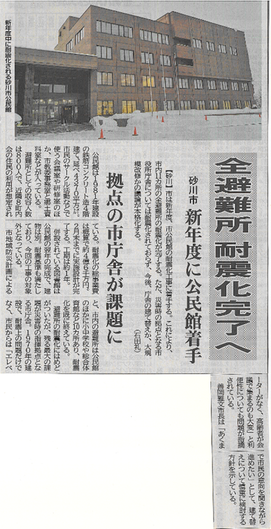 昨日24日(土)、道新の中・北空知版に以上のような「全避難所 耐震化完了へ」との見出しで、公民館の耐震化工事着手についての記事が掲載されました。