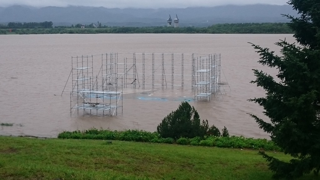 オアシスパークの管理棟周辺では7日(土)、8日に「THE 祭」というイベントが開催されます。例年ですとオアシスパークの湖面に近い所でステージとテントが張られて行われるのですが、石狩川の増水によりステージのある場所が冠水しています。(写真左)