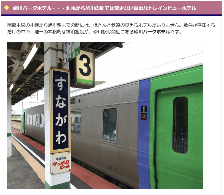 函館本線の札幌から旭川駅までの間には、ほとんど鉄道の見えるホテルが無いそうで、唯一の本格的な宿泊施設が「砂川パークホテル」だと書かれています。