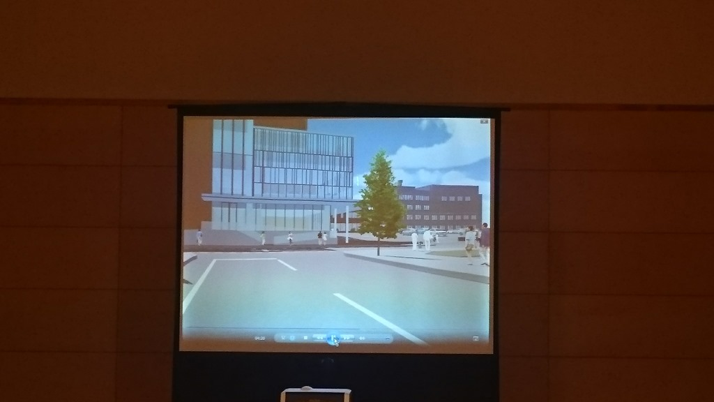 説明は角丸副市長の挨拶から始まって庁舎建設推進課の職員が行い、約30分。その後、総務文教・社会経済委員会連合審査会でも見た「アニメーション動画」(下の写真)が写されました。こちらの説明は大建設計の職員が行っています。