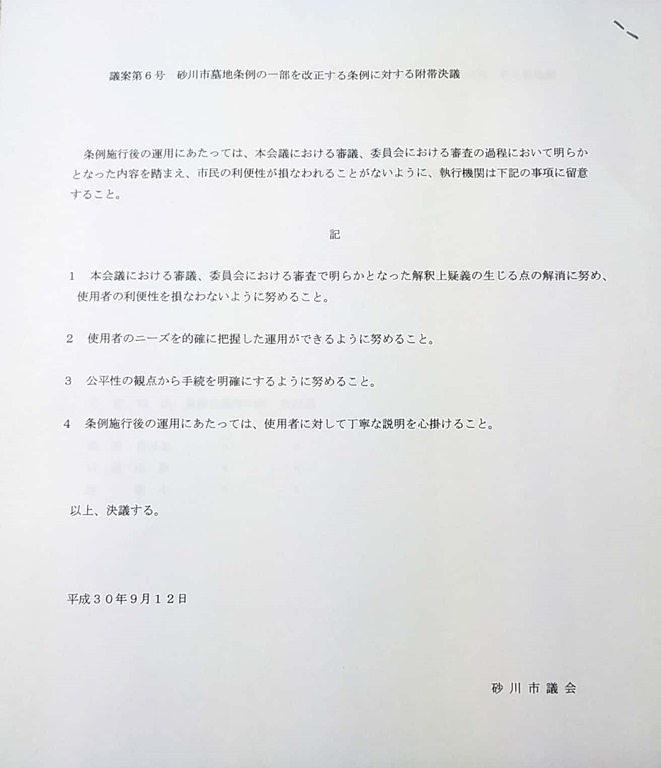 議案第6号「砂川市墓地条例の一部を改正する条例の制定について」の審議の結果、武田(圭)議員が提出した「附帯決議」は全会一致で可決。内容は下の写真です。
