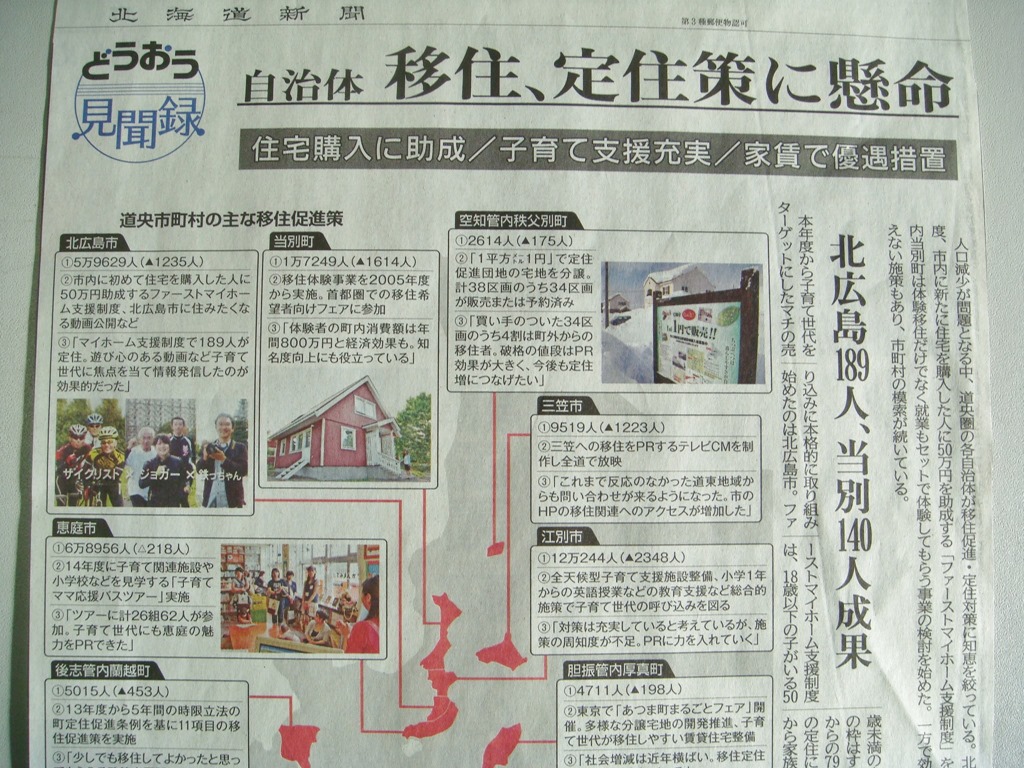内容は道央の自治体が「移住、定住」の政策を懸命に行っていて、その効果を報じるものです。