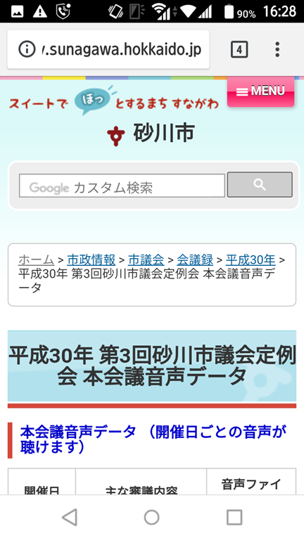 スマホを使うとすぐ聞けるので、こちらの方がお手軽です。砂川市のHP「組織から」→砂川市議会→音声データの順。