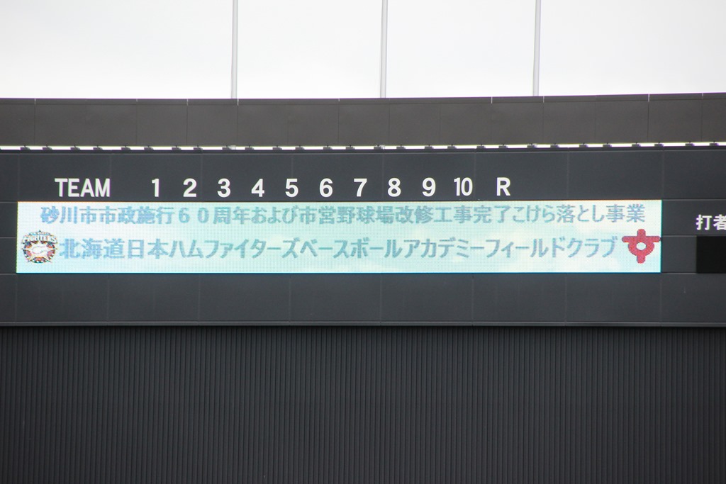 この事業は市営野球場のスコアボードに書かれた内容です。右の写真は本部席の操作機器。