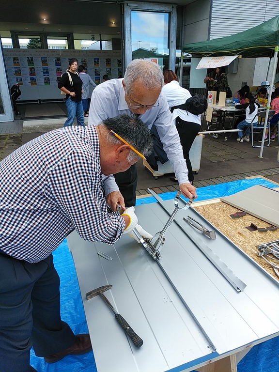 続いて「お仕事体験ブース」で私も板金屋さんの体験させていただきました。右の写真は建設業の大型重機で試乗もさせてもらえ、子ども達も興味津々。