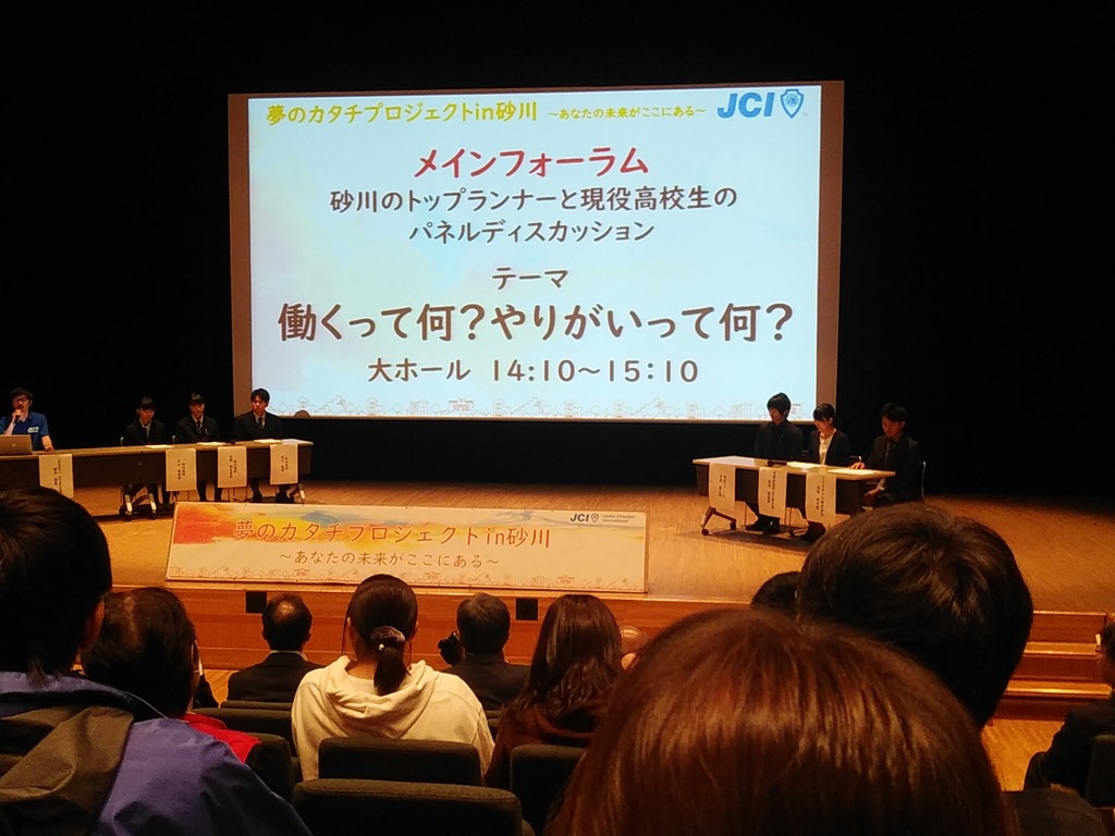 大ホールで開催されたパネルディスカッションです。砂川の企業(ソメスサドル、ほんだ菓子司、中道ファーム)に働く若い人達と高校生の話は面白かったです。