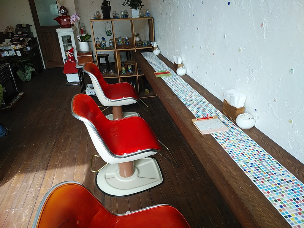 場所は国道12号線を少し入った中央市場の向かい中央公園の前で、60年近く続いた美容室「るり」の跡です。砂川の皆さんにはお馴染みの美容室だと思いますが、その当時の椅子もカウンターとして使われています。
