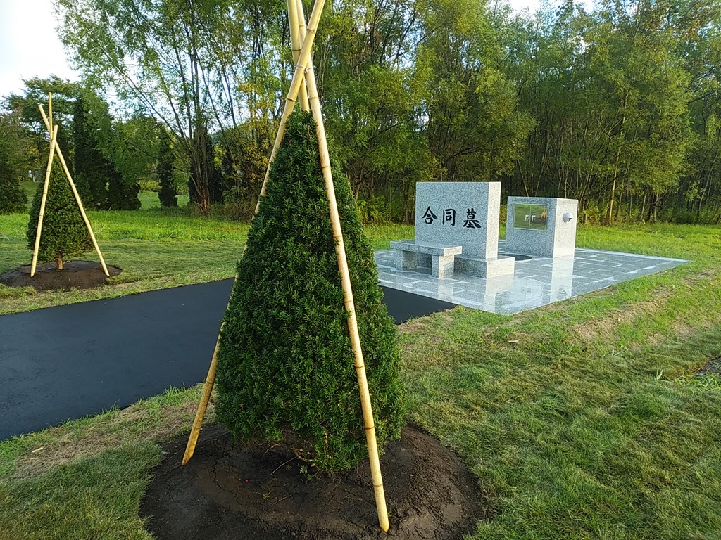 完成したというので社会経済委員会で視察した時とは違って合同墓の前に写真のように木が2本植えられ、芝生も増えて、以前より「様」になっているように私は思います。