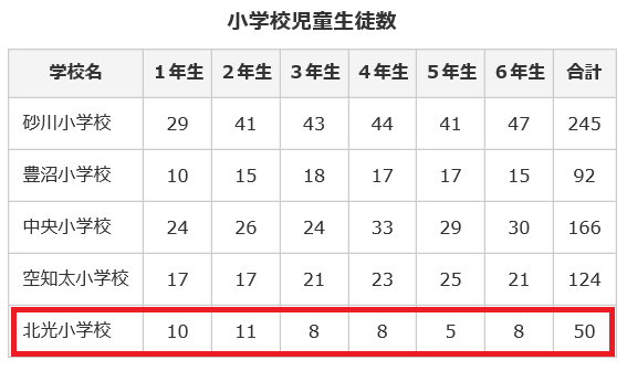 上の表は平成30年4月1日現在の小学校児童生徒数です。赤い線で囲ったところが参観日に行った北光小学校。