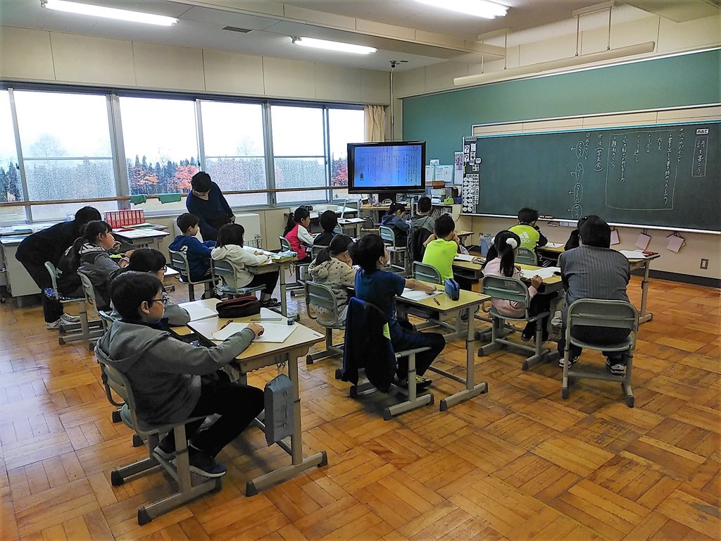 上の写真は2時間目の算数。一つの教室に右側3年生(8人)、左側4年生(8人)が背中合わせで座り、授業を受けています。授業を進める先生は一人ですし、はきはきとした先生ですから、先生の声は教室中に響いていました。