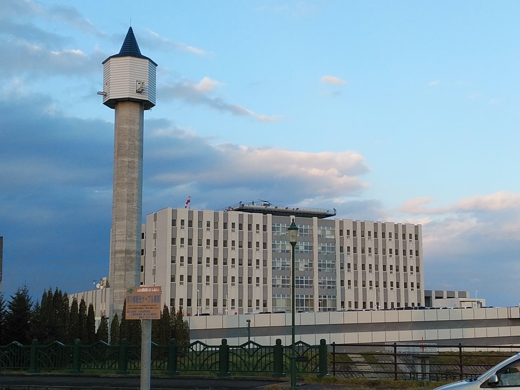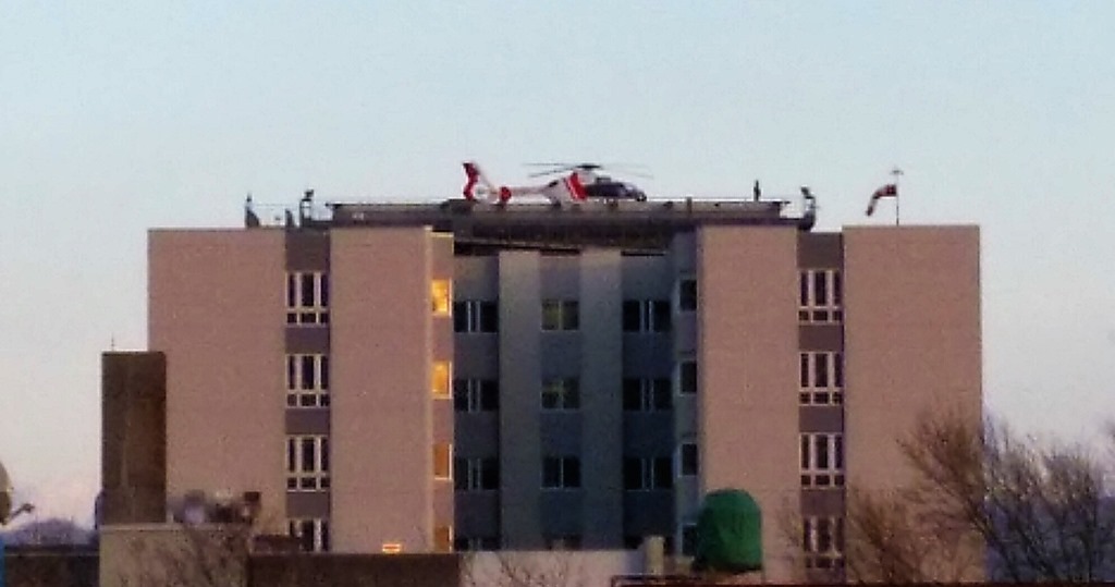 ドクターヘリが駐機中の屋上ヘリポートを横から見るとこんな感じ。「病院(医療)を核とした街づくり」を標榜する由縁です。
