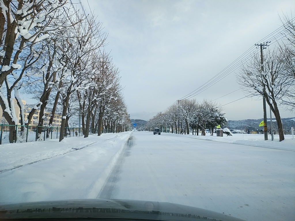 いよいよ、道路(車道も歩道)も真っ白。気温が低いので、車が走って雪が解けない状態になりました。まだまだ雪道に慣れないので、緊張しながらの運転です。